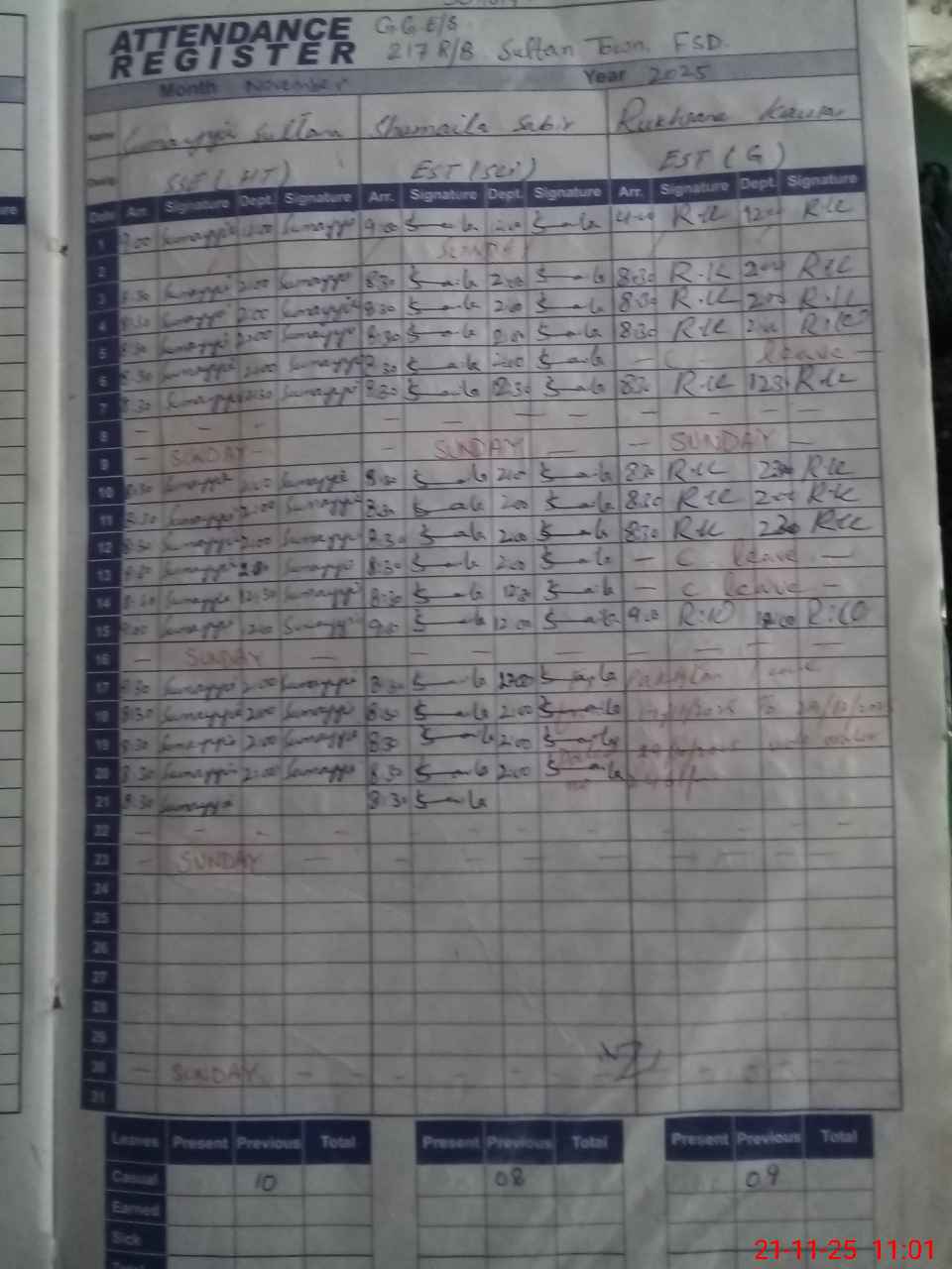 | CNIC | Full Name | Designation | R/C | Absence During Last Calender Month |