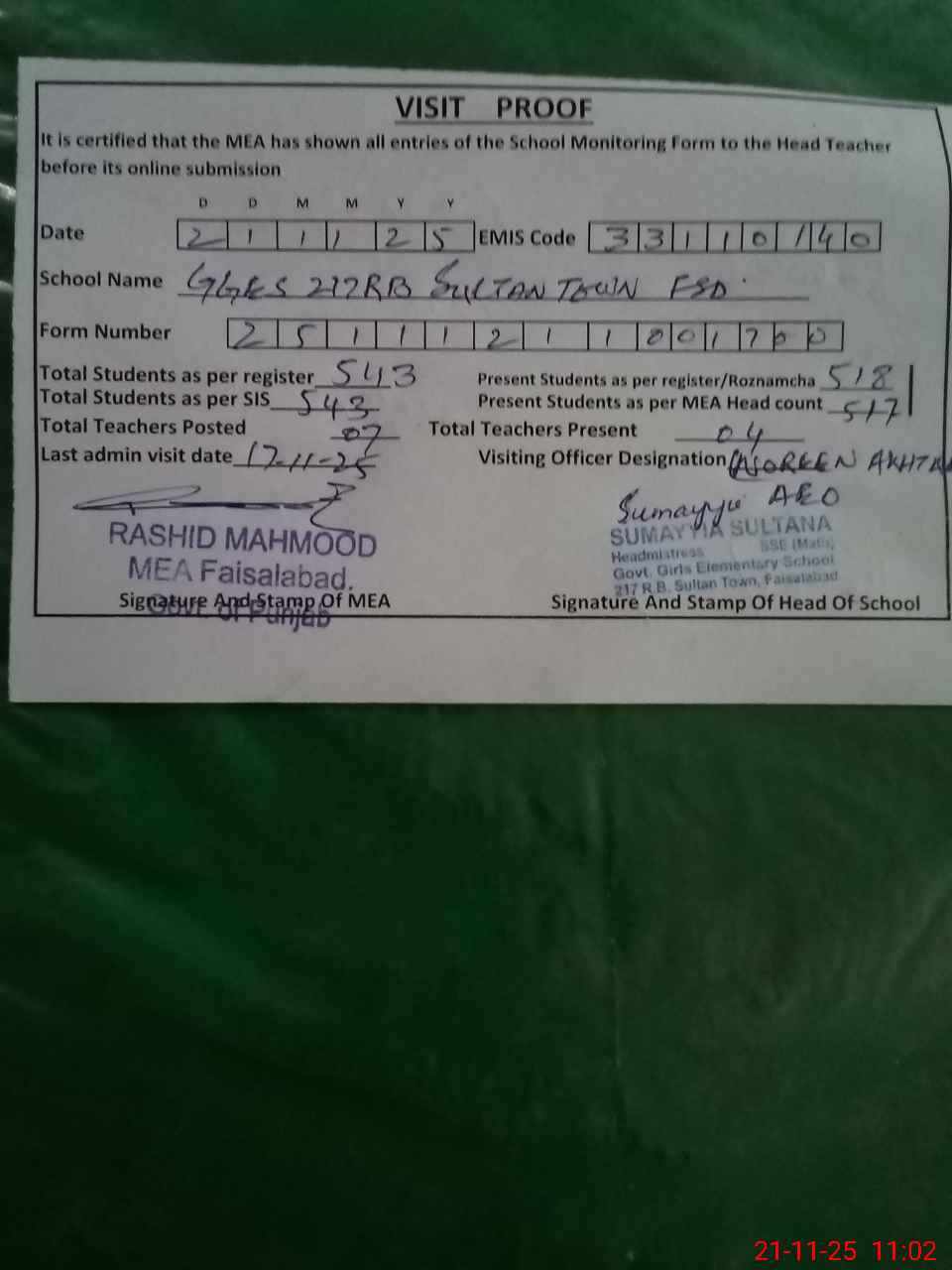 | Attendance Register | Head Teacher | MEA with School | Visit Proof |