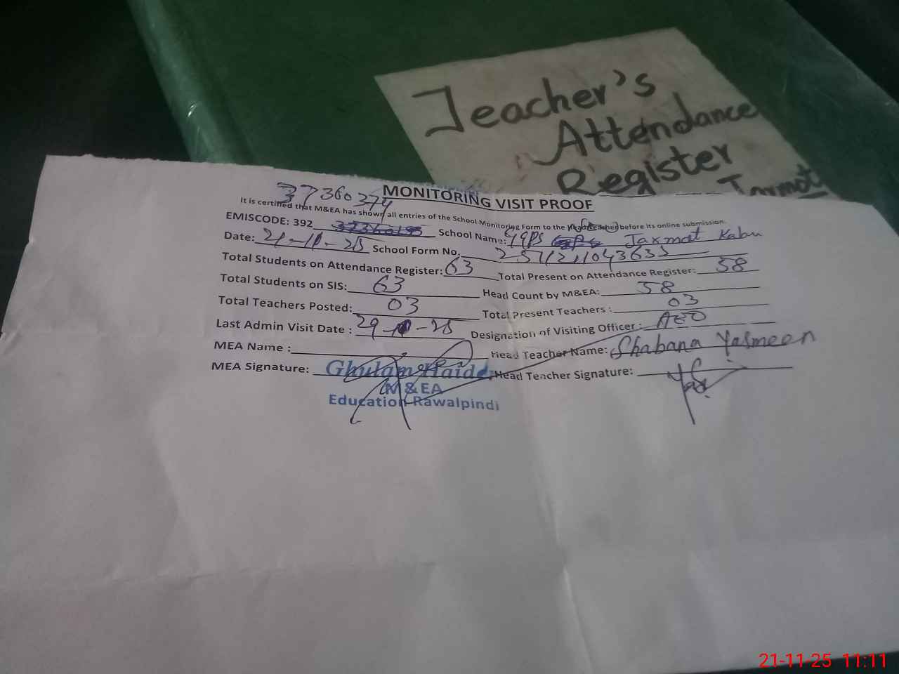 | Attendance Register | Head Teacher | MEA with School | Visit Proof |