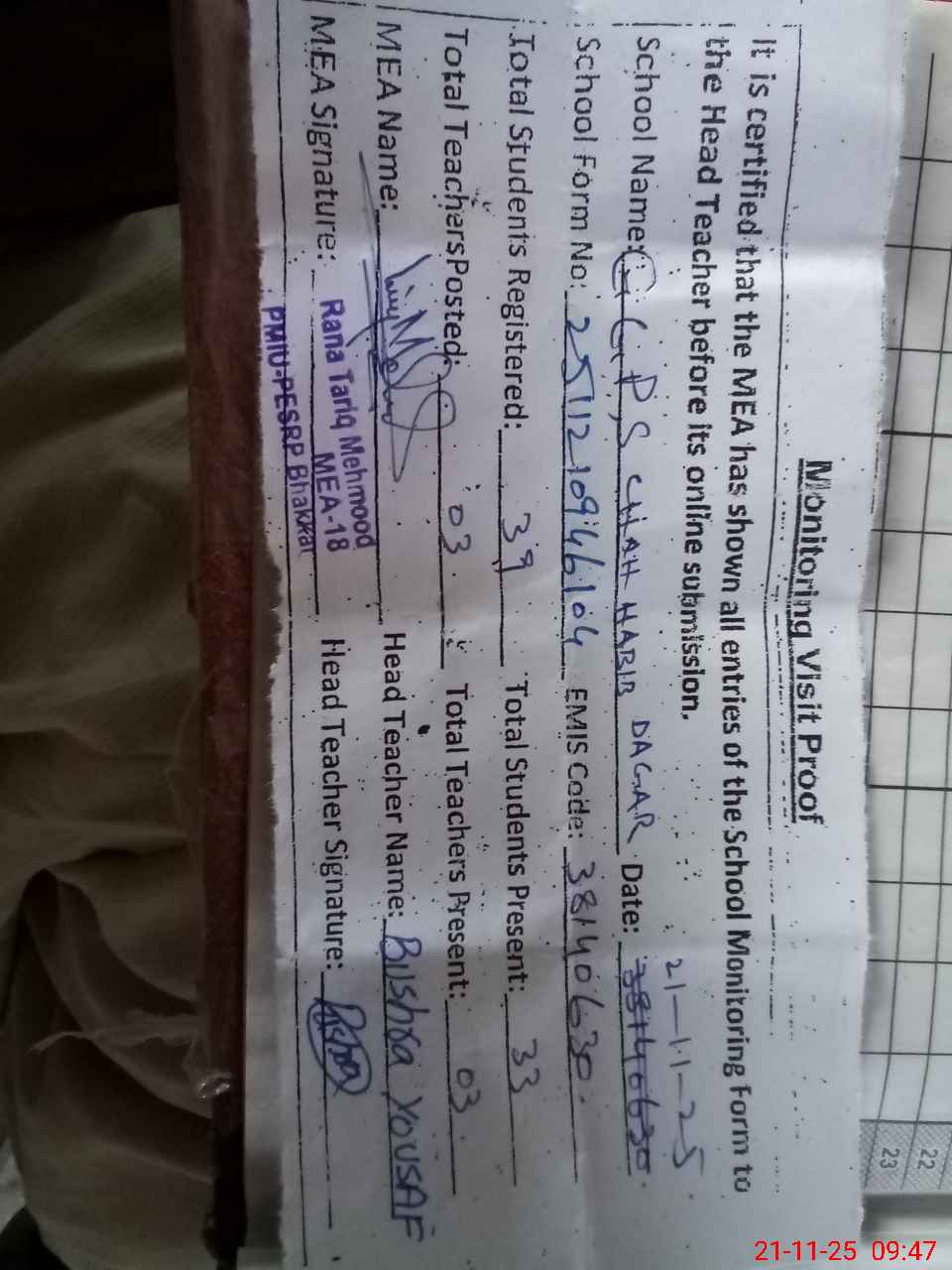 | Remarks (Use Separate Page if Required): LAST VISIT OF EDUCATION AUTHORITY 1 DESIGNSTION. AEO 2 NAME. AASMA YASIN 3 DATE OF VISIT 22 Oct. 2025 | |||||