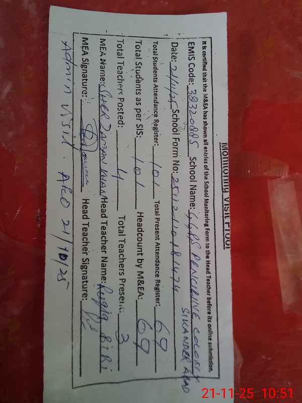 | EMIS Code: 38320885 | Name of School: GGPS PENCILIN COLONY SIKANDER ABAD | |||
