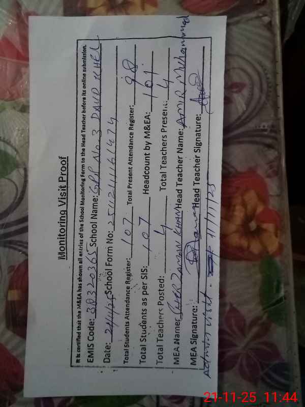 | EMIS Code: 38320365 | Name of School: GPS NO. 3 DAUD KHEL | |||