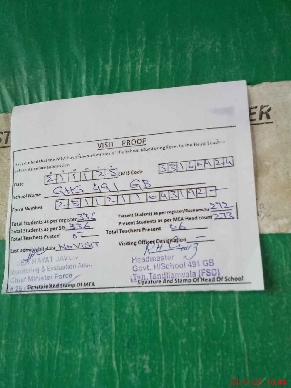 | EMIS Code: 33160424 | Name of School: GHS CHAK 491 GB TANDLIANWLA | |||