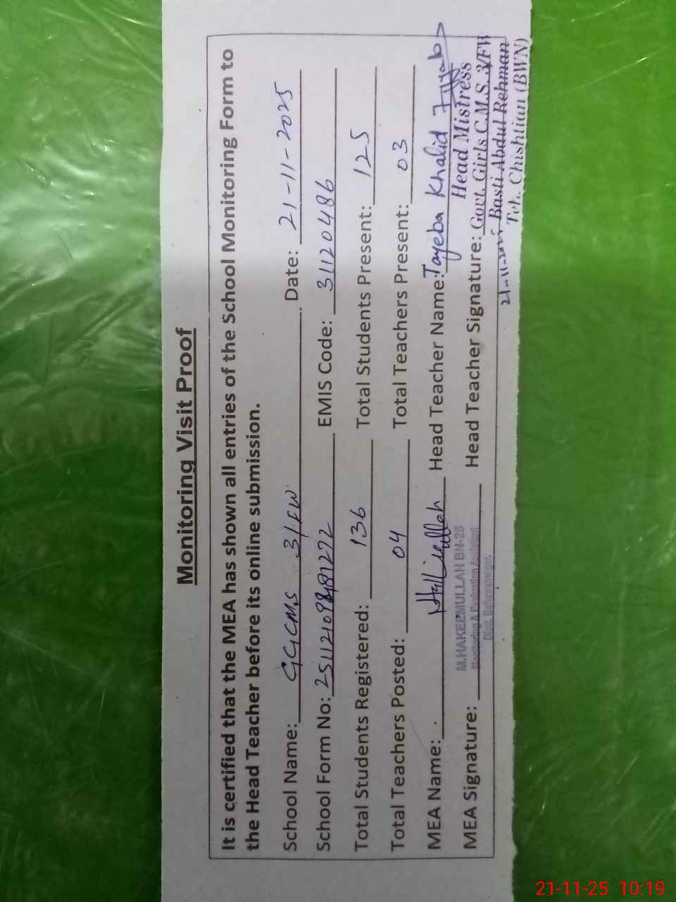 | EMIS Code: 31120486 | Name of School: GGCMS CHAK NO. 3/FW | |||
