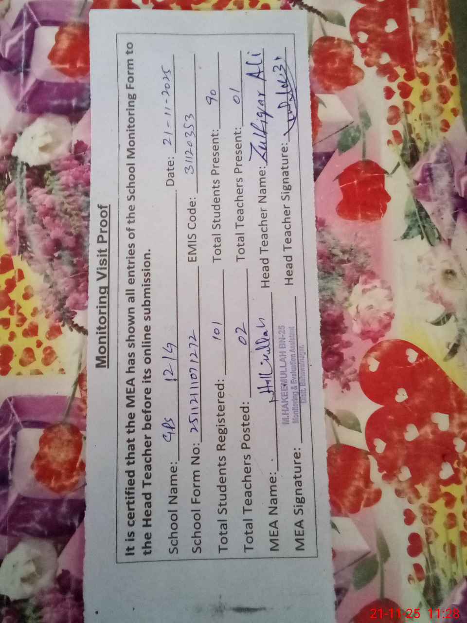 | Attendance Register | Head Teacher | MEA with School | Visit Proof |