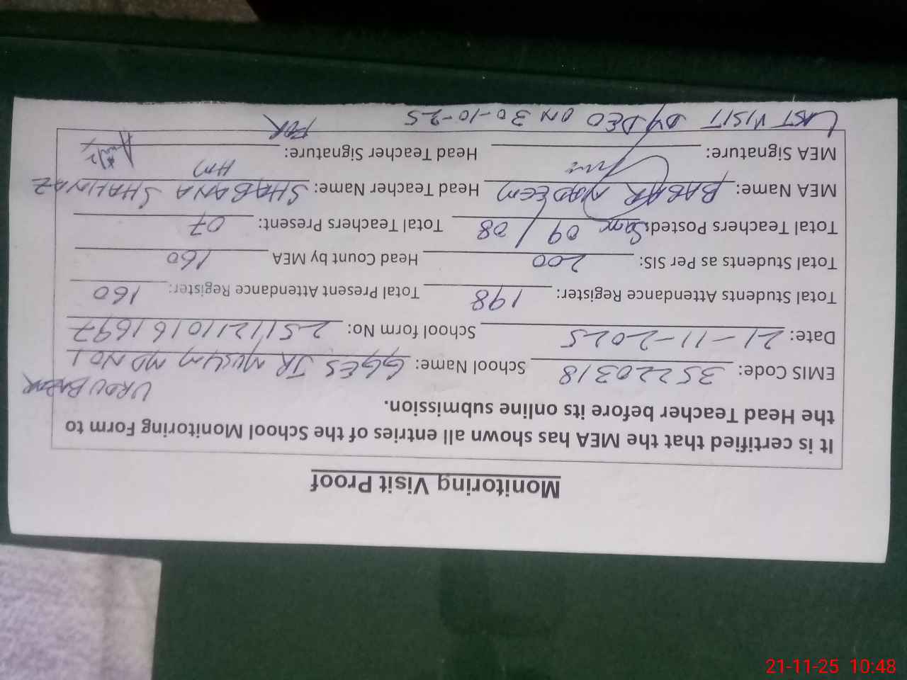 | Certified that this School was Inspected by the Undersigned MEA/DMO Today and the Information Stated Above is as Per Record. | |||||