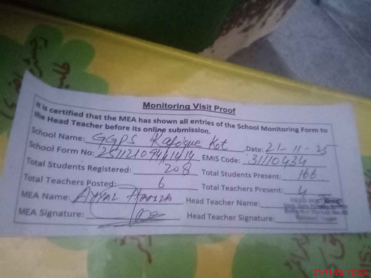 | Attendance Register | Head Teacher | MEA with School | Visit Proof |