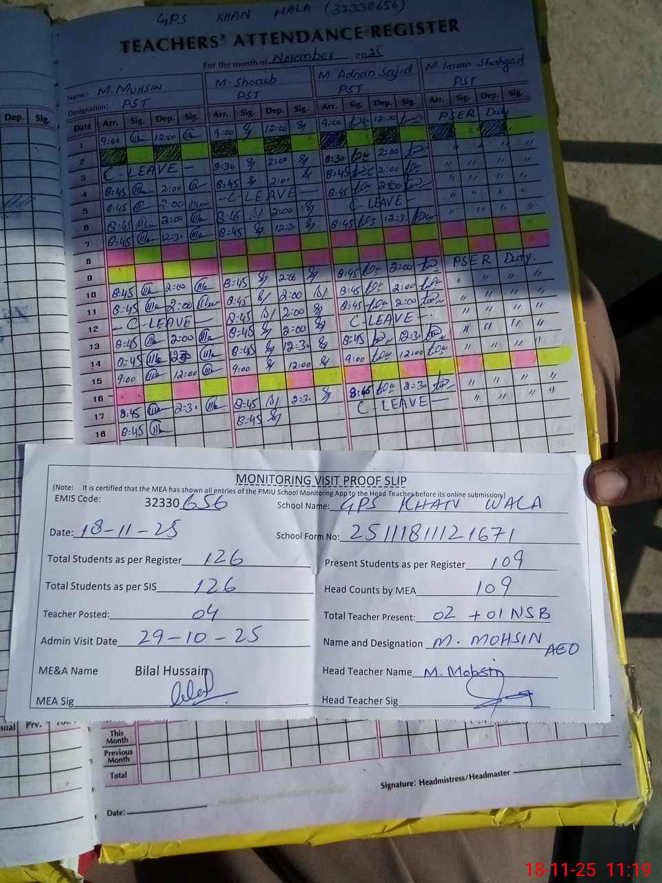 | Attendance Register | Head Teacher | MEA with School | Visit Proof |