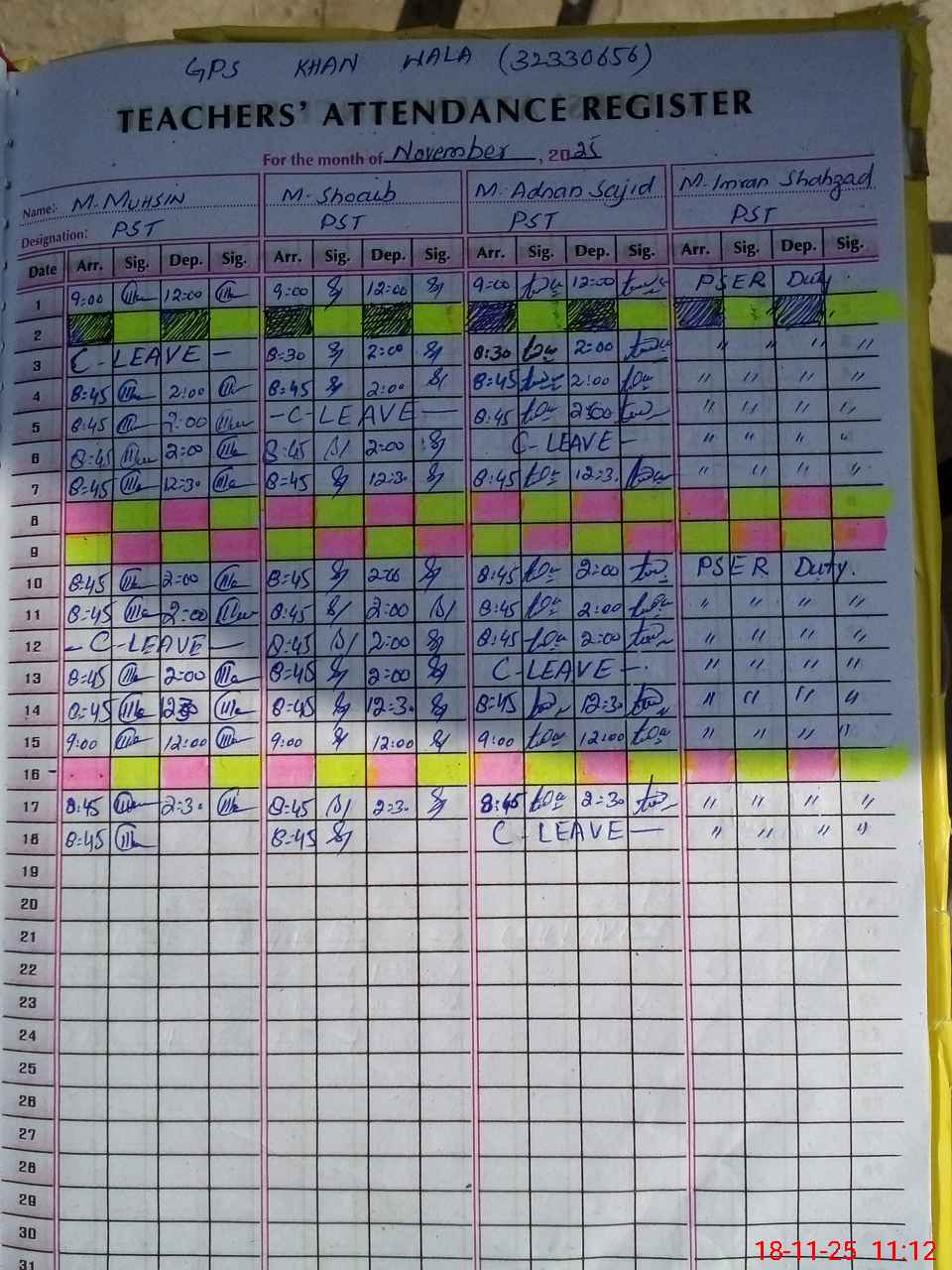 | CNIC | Full Name | Designation | R/C | Absence During Last Calender Month |