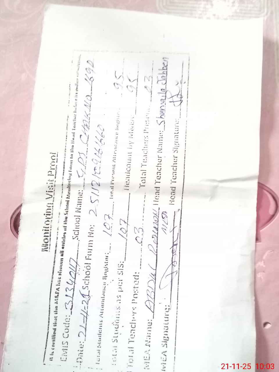 | Attendance Register | Head Teacher | MEA with School | Visit Proof |