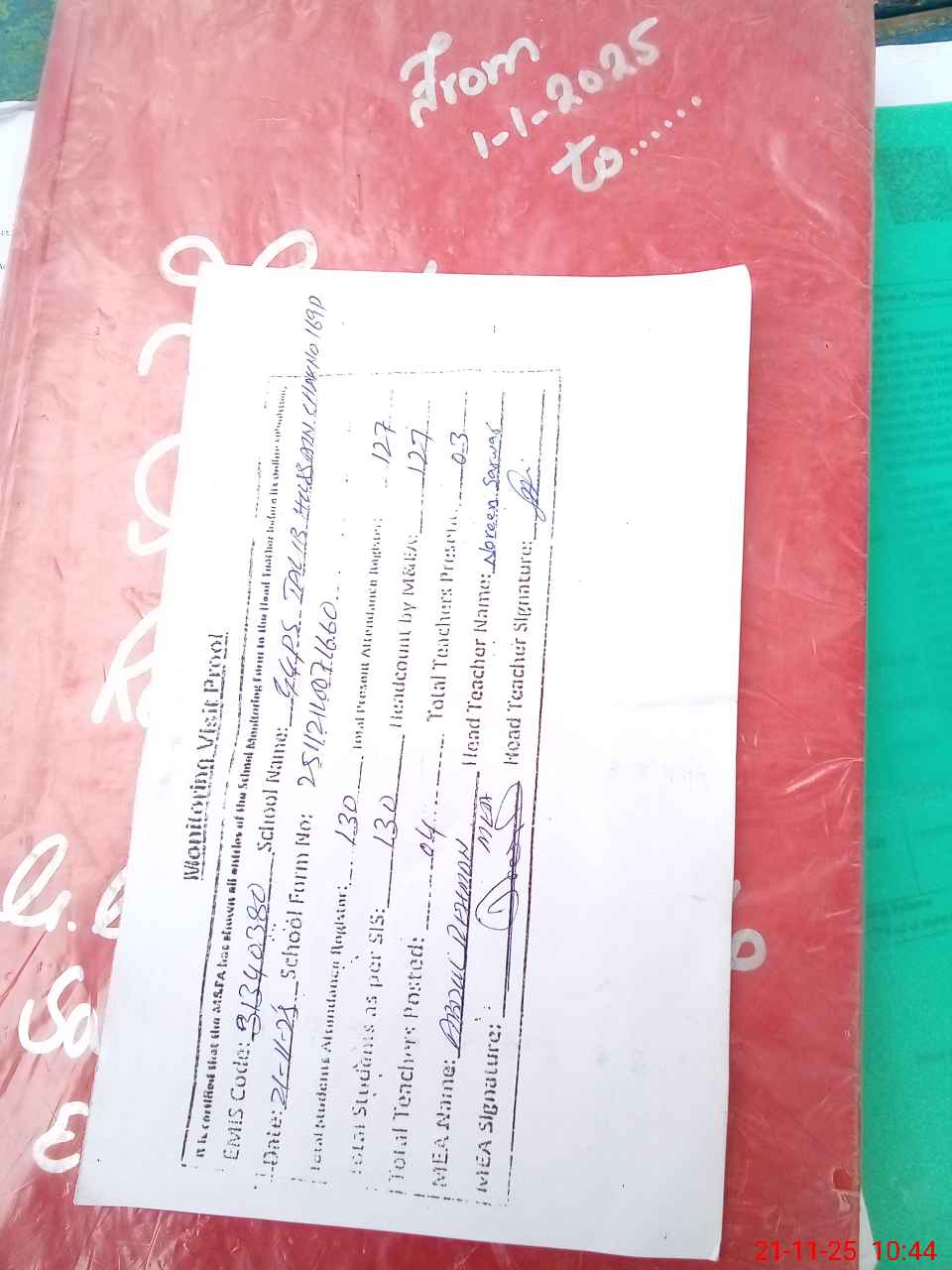 | Attendance Register | Head Teacher | MEA with School | Visit Proof |