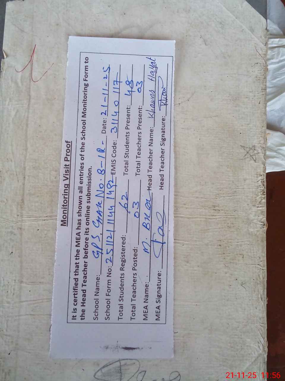 | EMIS Code: 31140117 | Name of School: GPS CHAK NO. 8/1-R | |||