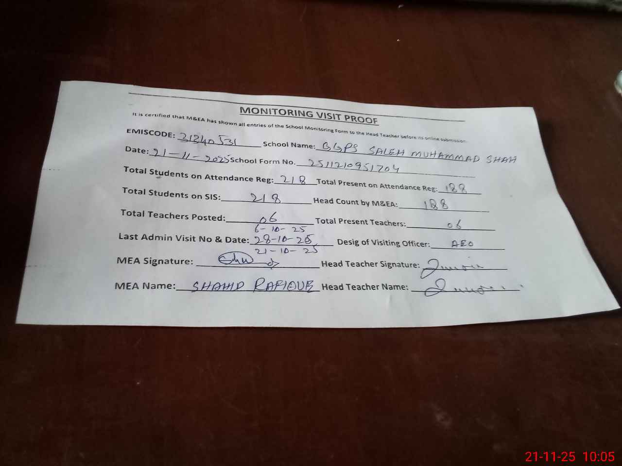 | Monitoring Date: 21-11-2025 | Start Time: 21-11-2025 09:25 AM | End Time: 21-11-2025 10:05 AM | Name of MEA: Sh**** Ra**** | |