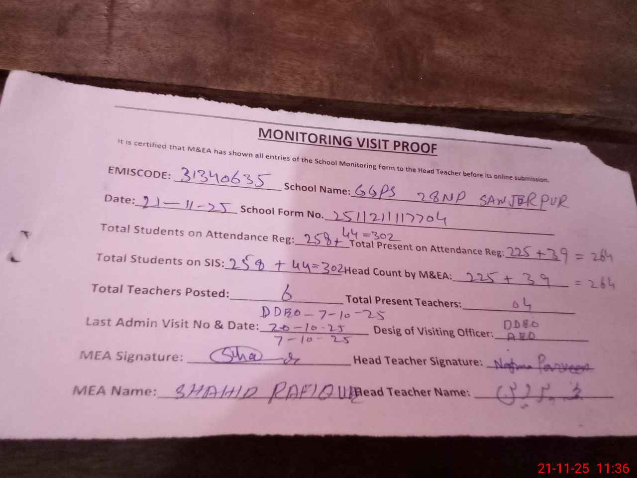 | Attendance Register | Head Teacher | MEA with School | Visit Proof |
