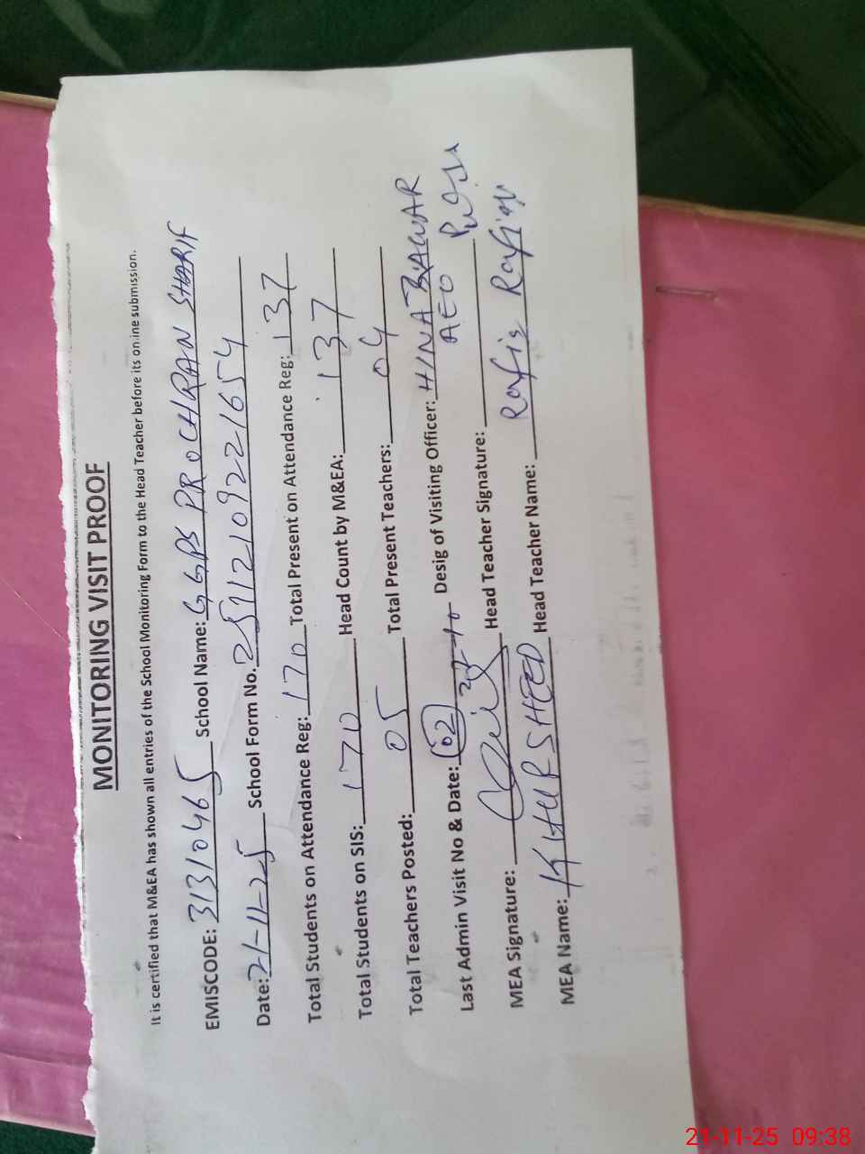 | Attendance Register | Head Teacher | MEA with School | Visit Proof |