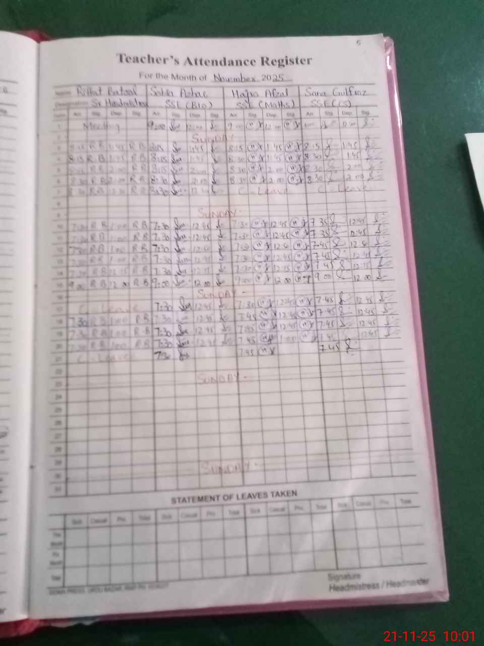 | 38**** | Ri**** Ba**** | Sr. Headmaster | Regular | 0 | 0 | 0 | 0 | 0 | 0 | 0 | 0 | 0 | Casual |