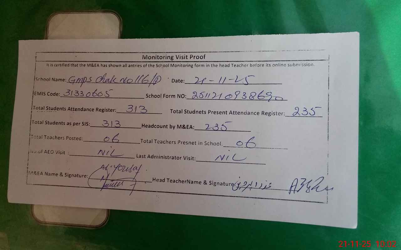 | EMIS Code: 31330605 | Name of School: GMPS CHAK NO. 116/P | |||
