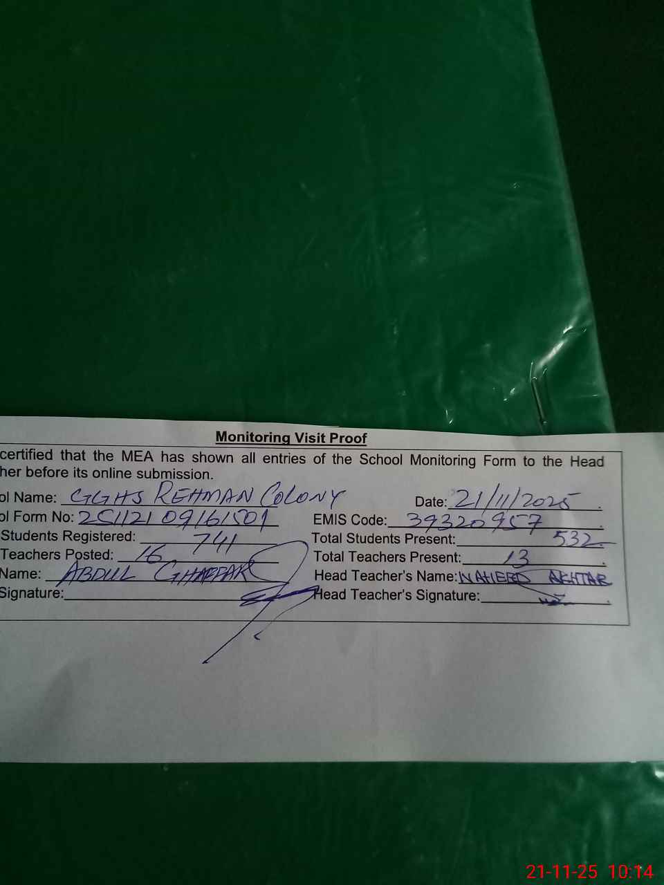 | Attendance Register | Head Teacher | MEA with School | Visit Proof |