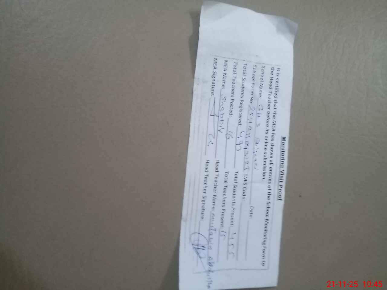| Attendance Register | Head Teacher | MEA with School | Visit Proof |