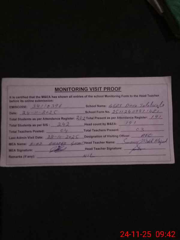 | EMIS Code: 34110396 | Name of School: GGPS DERA TALAB WALA | |||