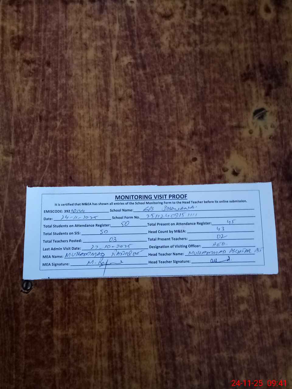 | Attendance Register | Head Teacher | MEA with School | Visit Proof |