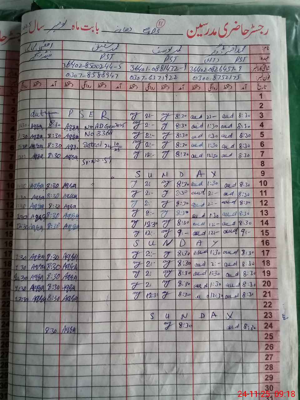 | CNIC | Full Name | Designation | R/C | Absence During Last Calender Month |
