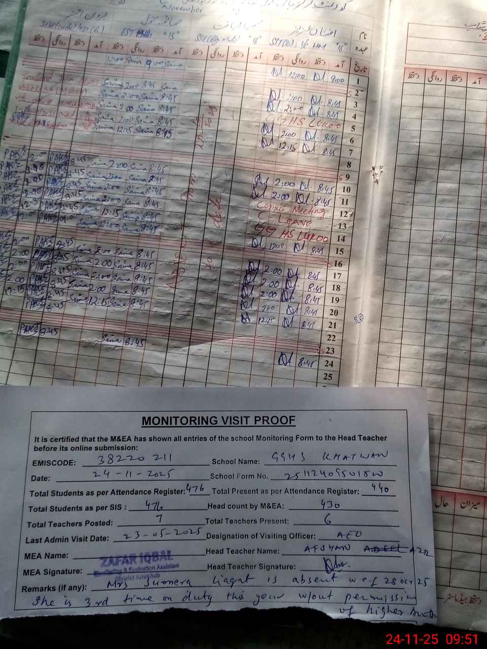 | Remarks (Use Separate Page if Required): last visit AEO 23 may 2025 Total on register 476 Total on register 476 Miss sumera lialqat is on duty wef 28 oct 2025 till today on 3rd consecutive time this year despite the refusal of higher authorities. | |||||