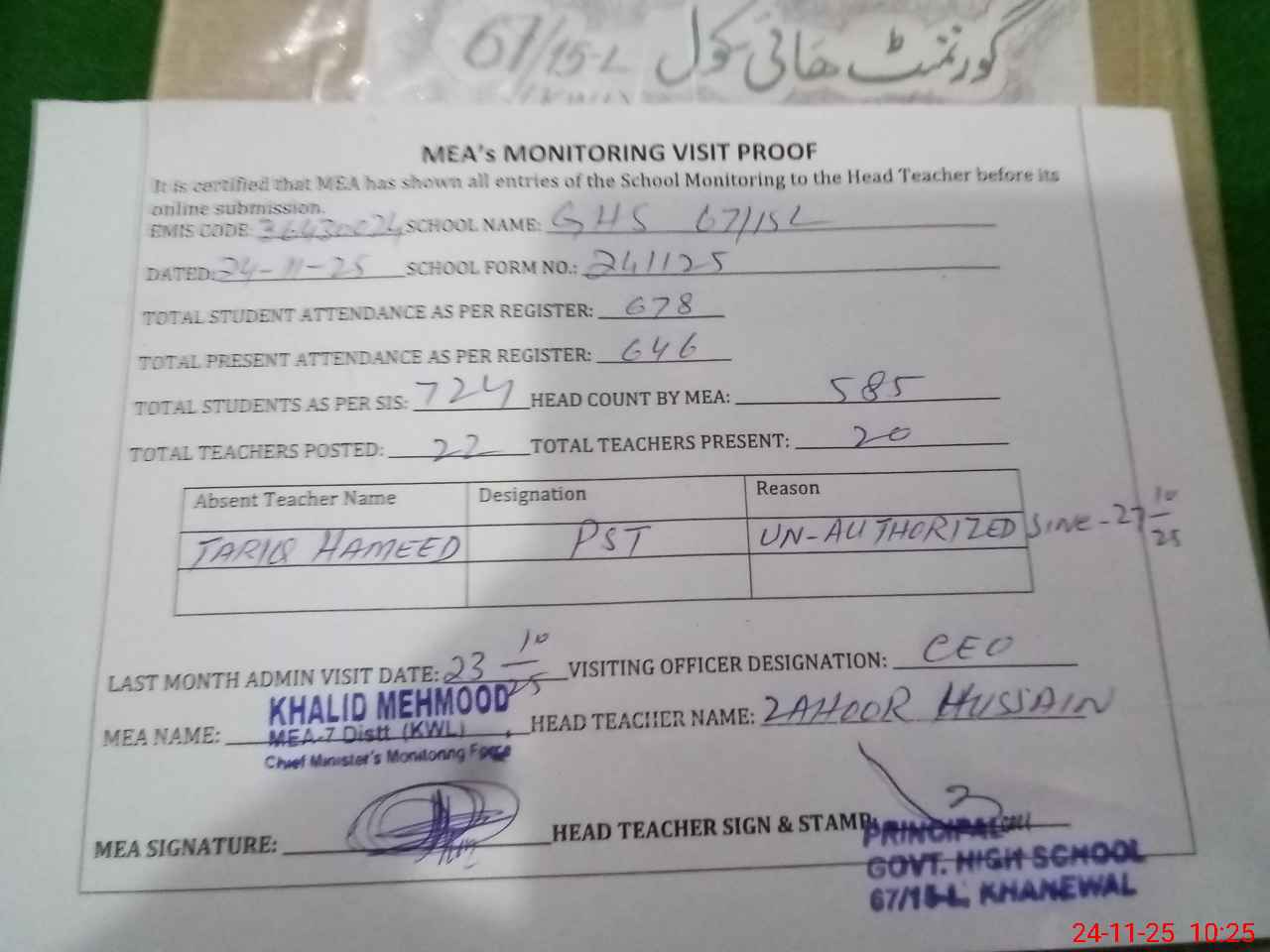 | Attendance Register | Head Teacher | MEA with School | Visit Proof |
