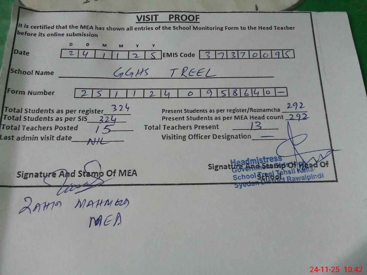 | Attendance Register | Head Teacher | MEA with School | Visit Proof |