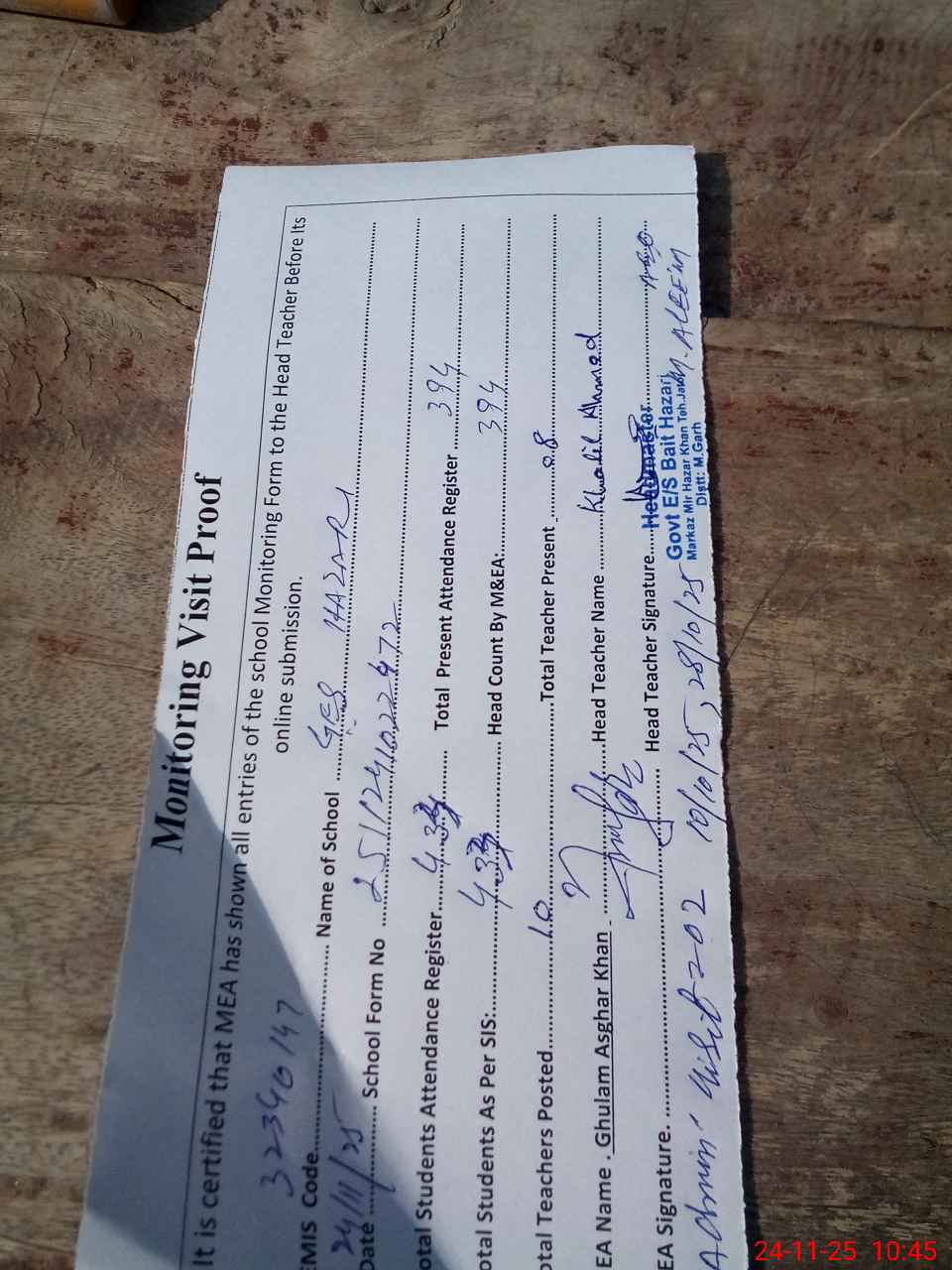 | Attendance Register | Head Teacher | MEA with School | Visit Proof |