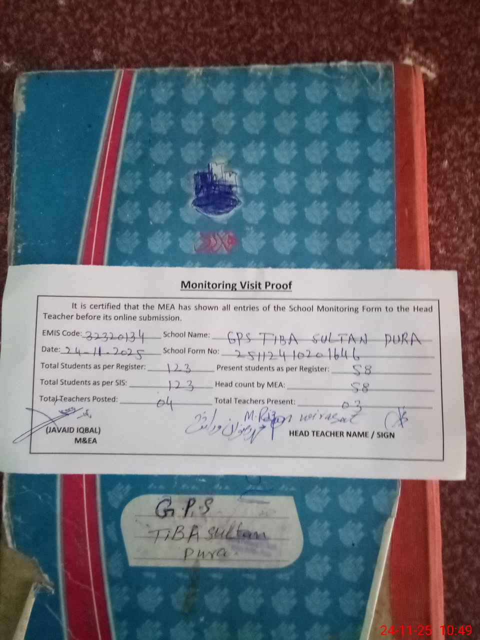 | Attendance Register | Head Teacher | MEA with School | Visit Proof |