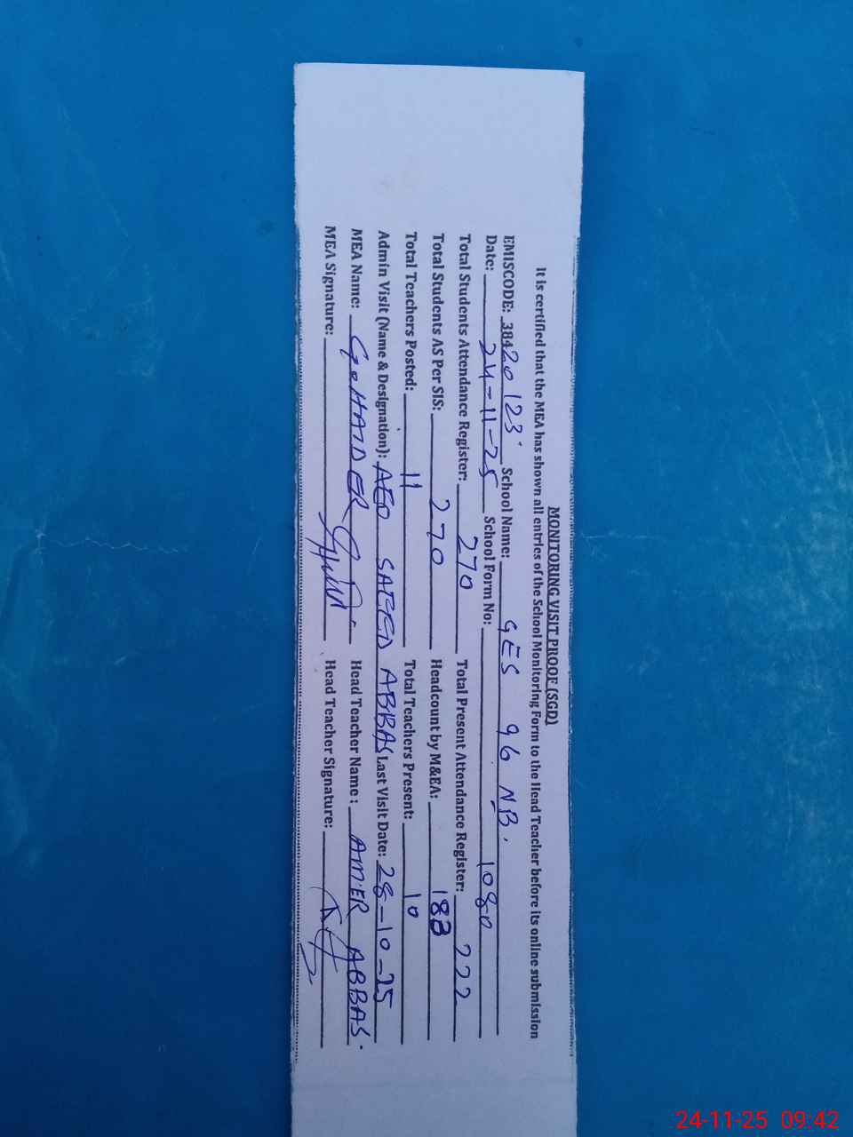 | Attendance Register | Head Teacher | MEA with School | Visit Proof |