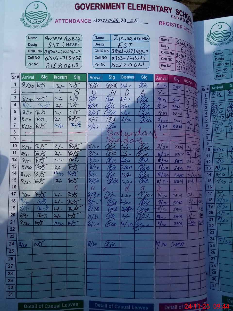 | CNIC | Full Name | Designation | R/C | Absence during last cal. month |