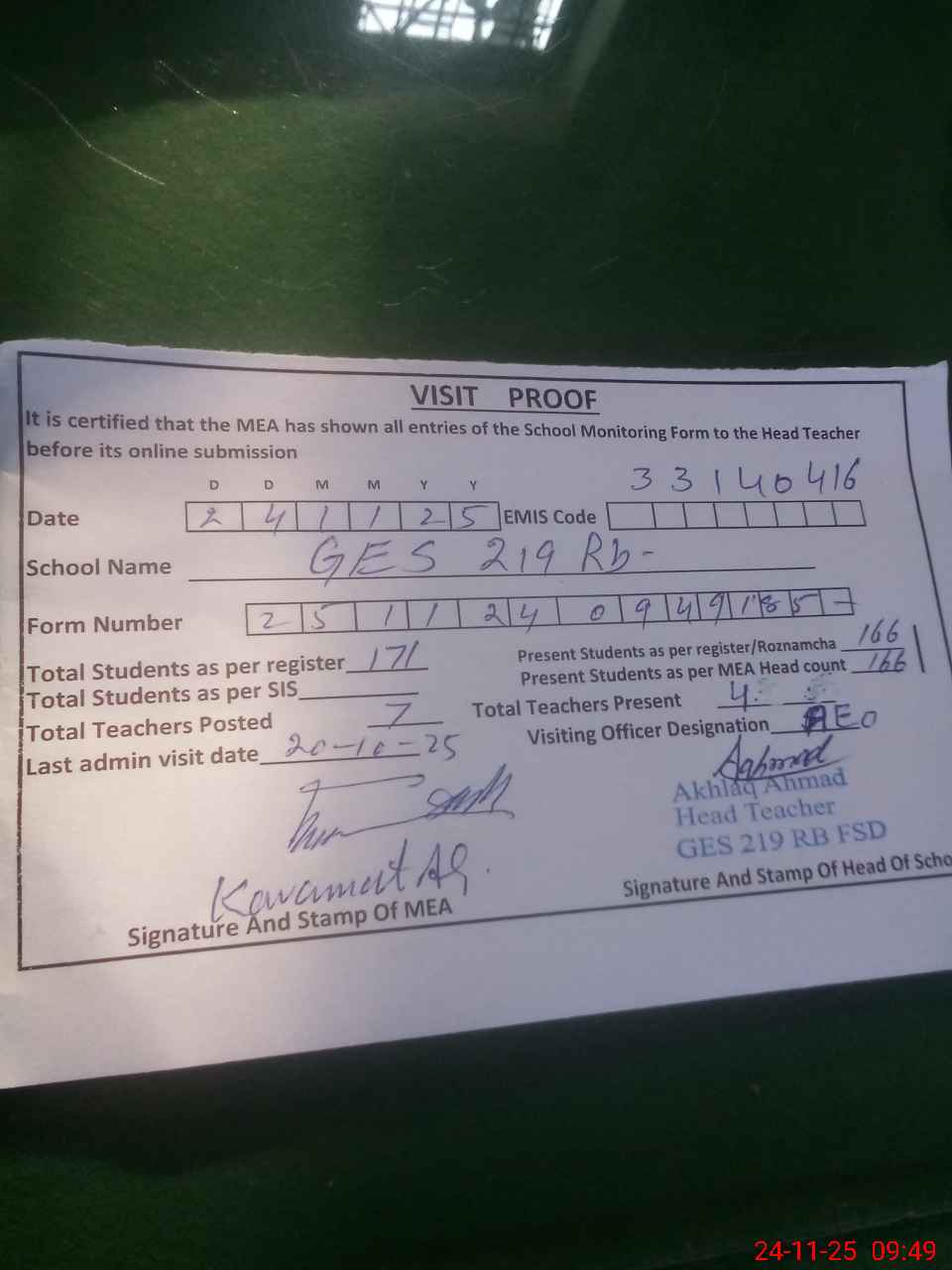 | Attendance Register | Head Teacher | MEA with School | Visit Proof |