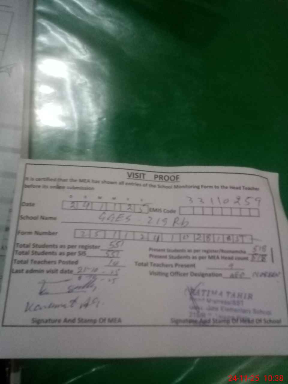 | Attendance Register | Head Teacher | MEA with School | Visit Proof |