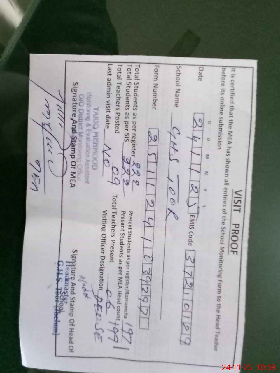 | Name: Ta**** Me**** Hu**** Designation: (School Headmaster's/Headmistress's) HEADMASTER Phone/Cell Number: 03**** |