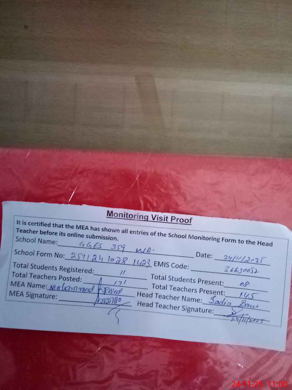 | Attendance Register | Head Teacher | MEA with School | Visit Proof |