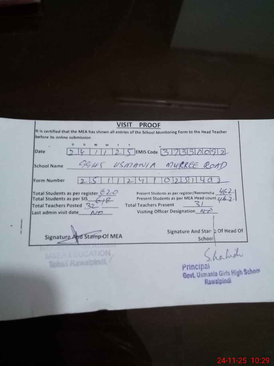 | Attendance Register | Head Teacher | MEA with School | Visit Proof |