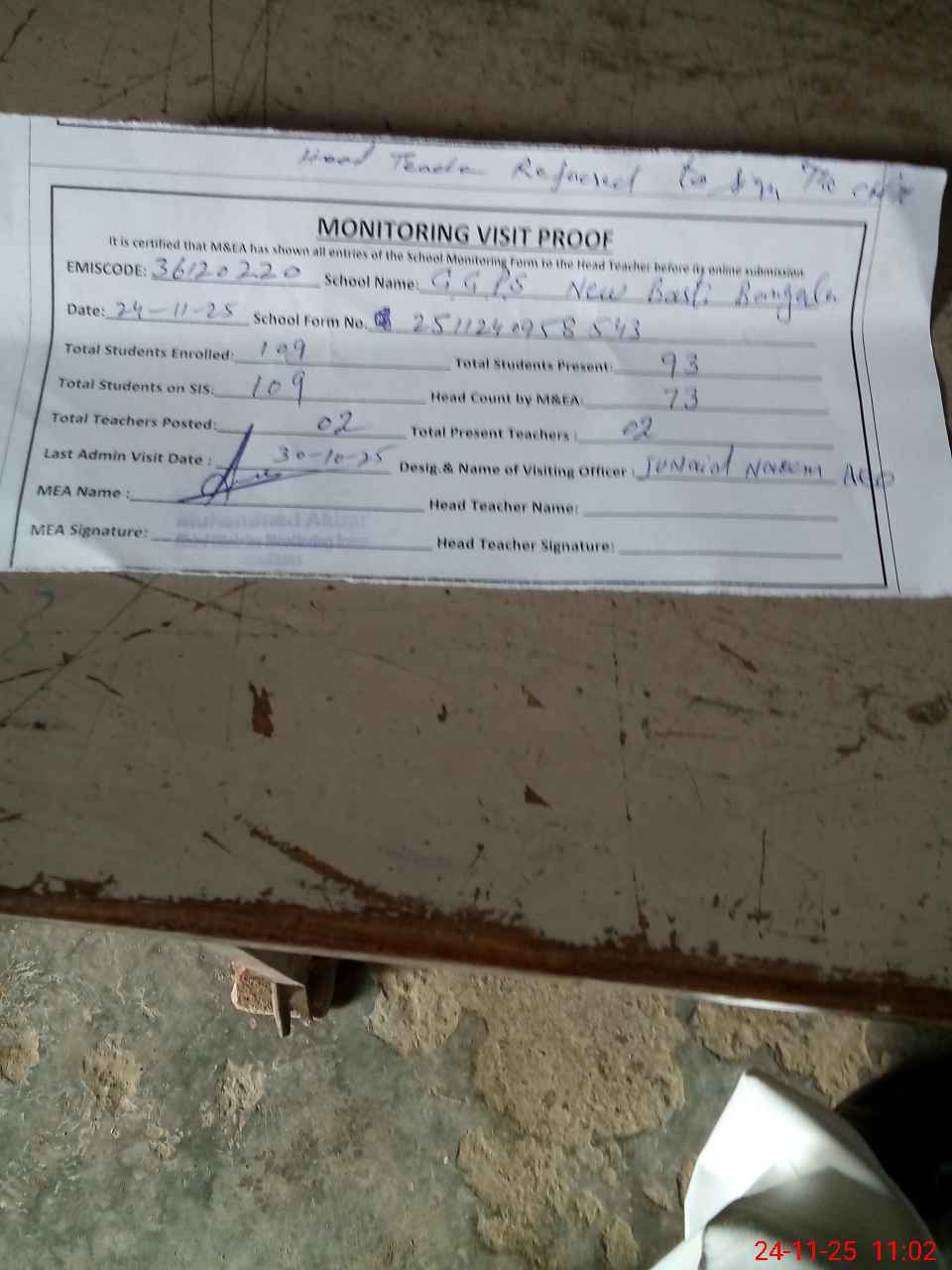 | Attendance Register | Head Teacher | MEA with School | Visit Proof |