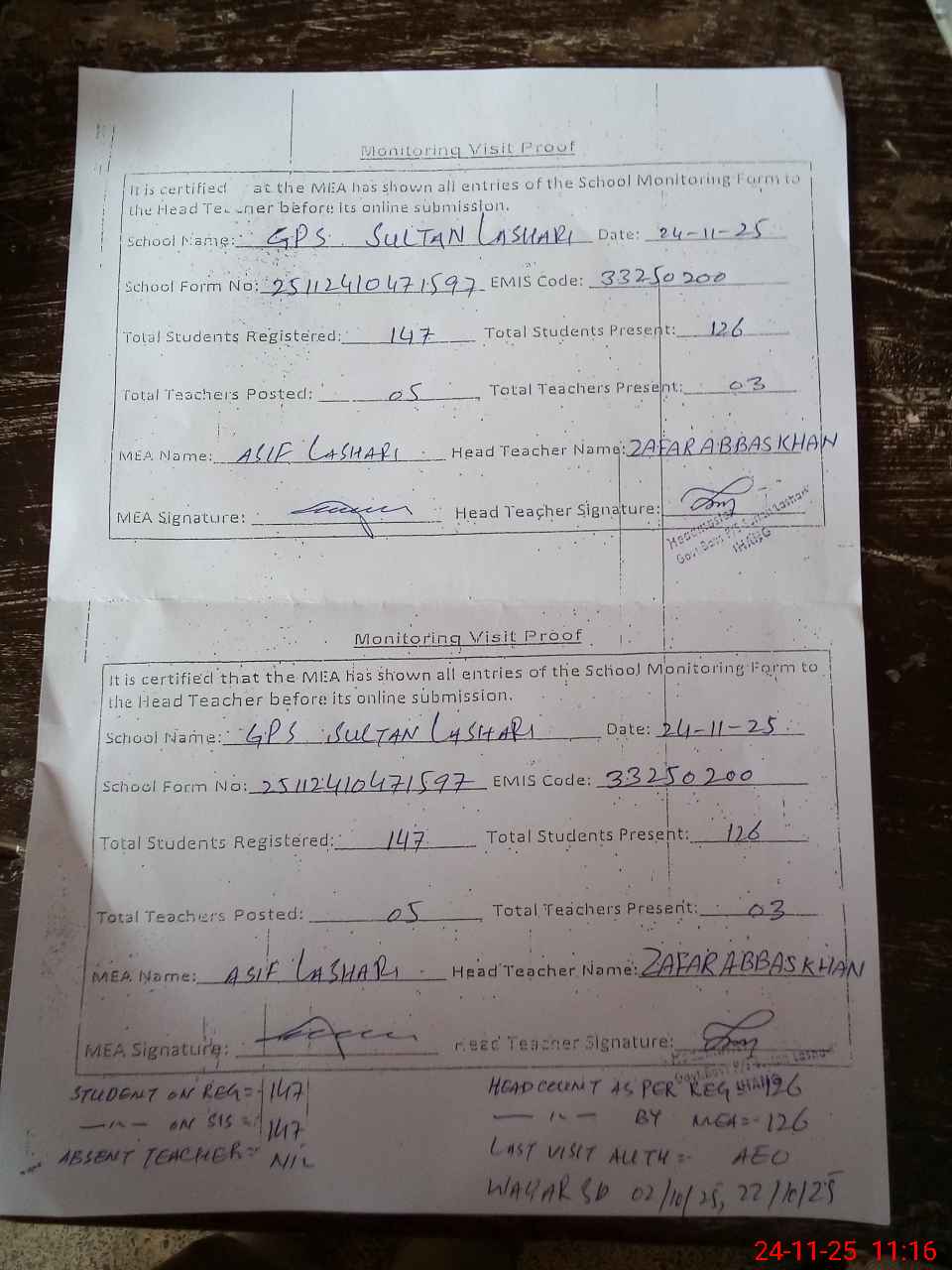 | Attendance Register | Head Teacher | MEA with School | Visit Proof |