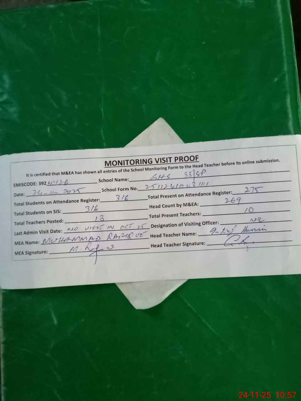 | Attendance Register | Head Teacher | MEA with School | Visit Proof |