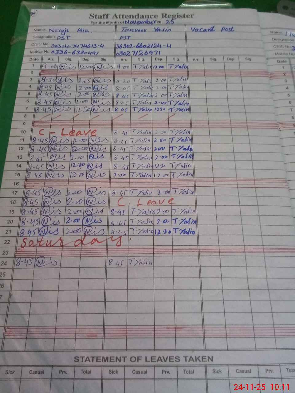 | CNIC | Full Name | Designation | R/C | Absence During Last Calender Month |