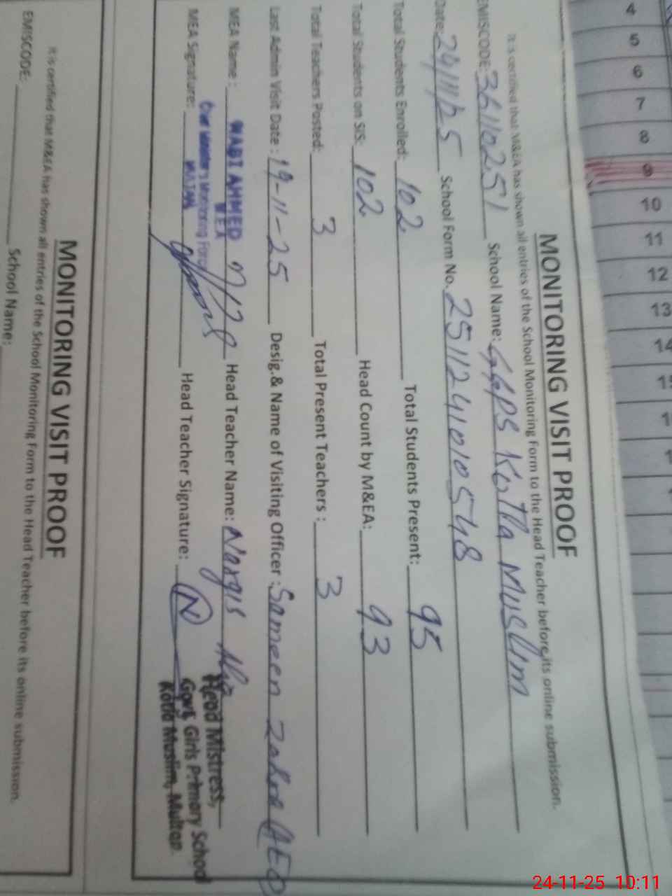| Attendance Register | Head Teacher | MEA with School | Visit Proof |