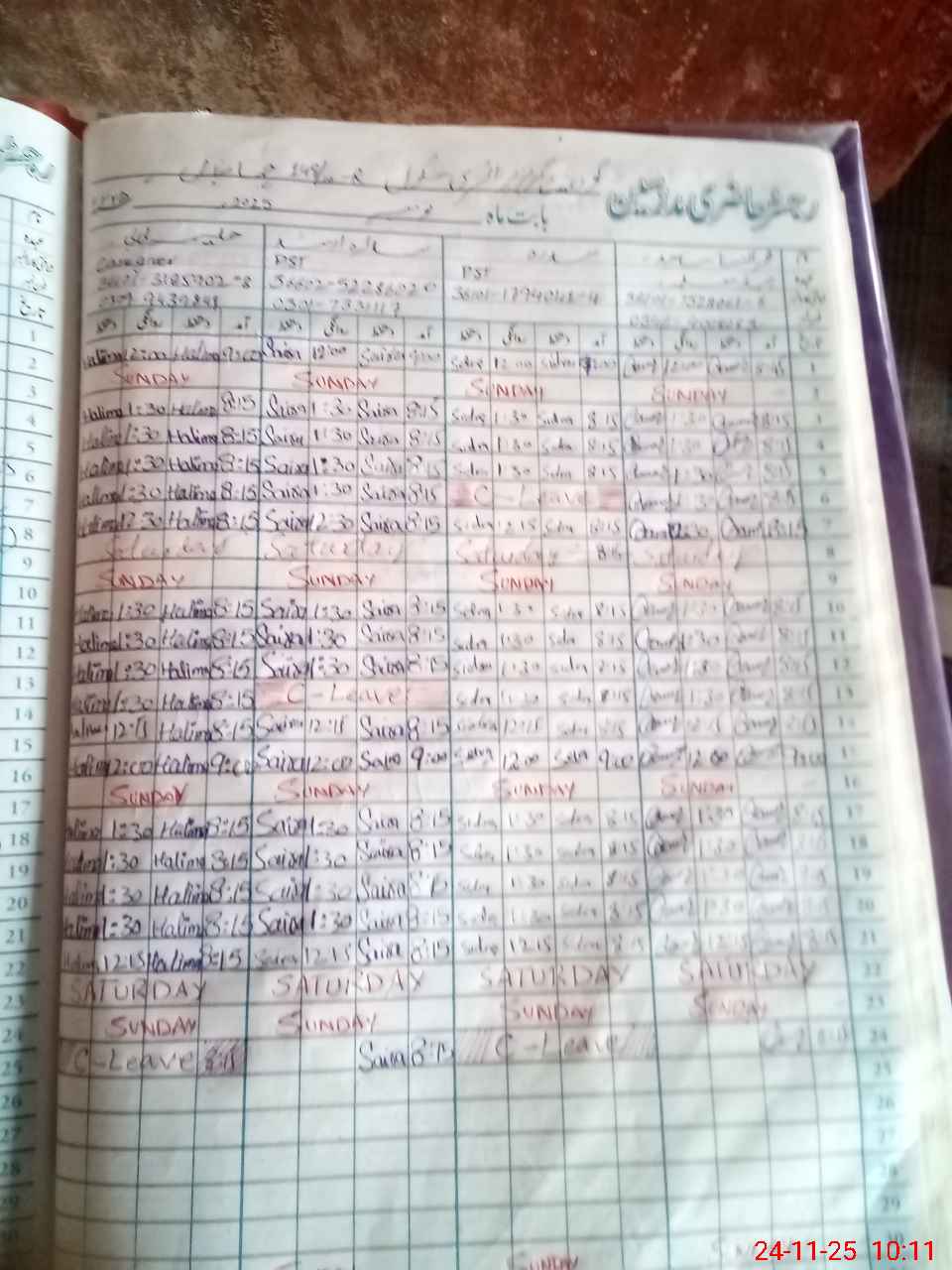 | Leave | Duty | Absent | Maternity | Medical | Ex- Pak |