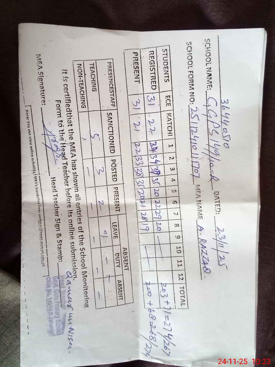 | Attendance Register | Head Teacher | MEA with School | Visit Proof |