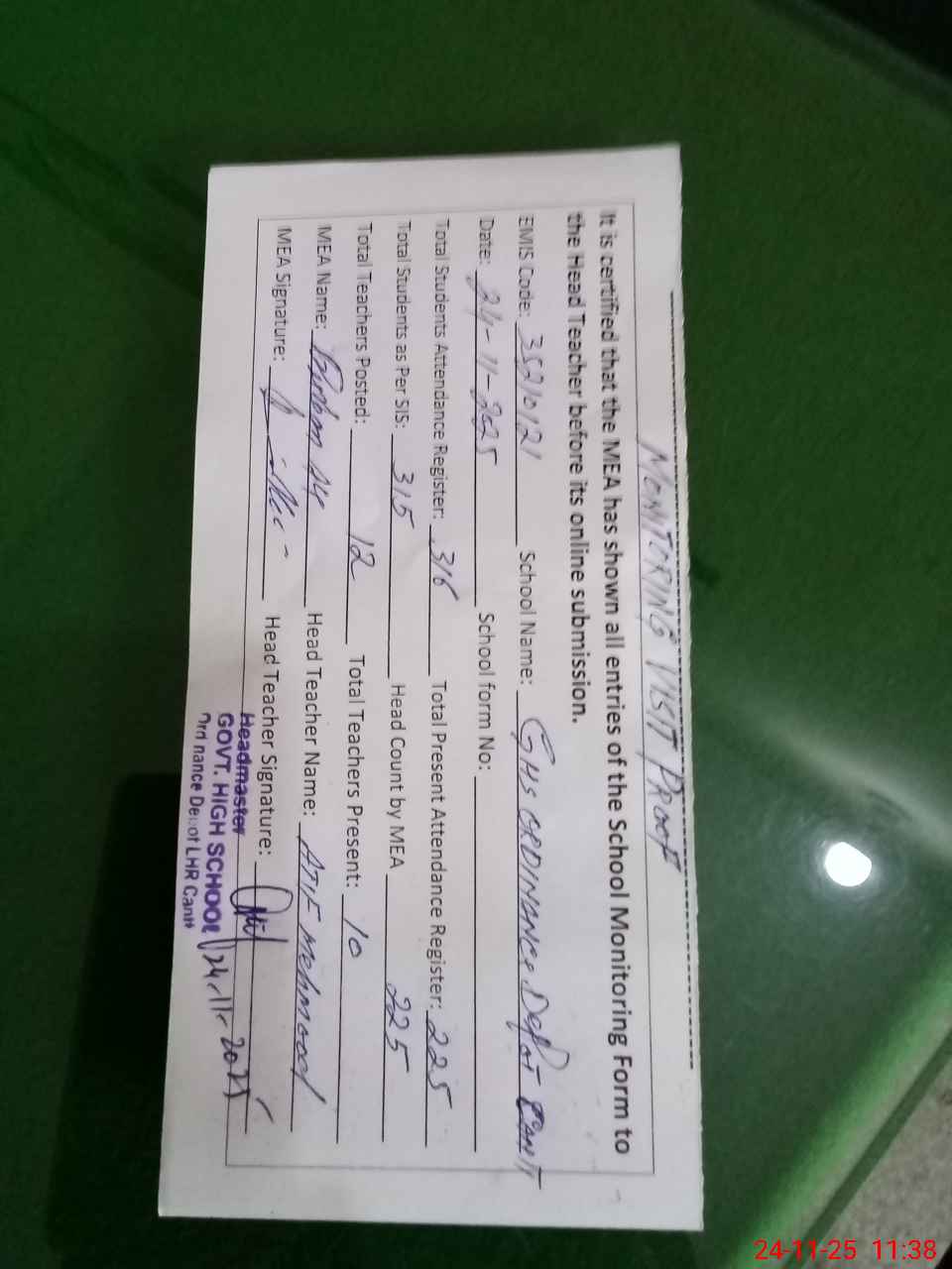 | Remarks (Use Separate Page if Required): Administrator visit of Assistant Education Officer in the school not available. Administrator visit of the Dy DEO in the school on 1st October 2025 and 30th October 2025 NSB record not updated on sis wef 22.10.2024 to till today Teacher Urooj Akram pst absent from the school with out intimation wef 19.11.25 to till today | |||||