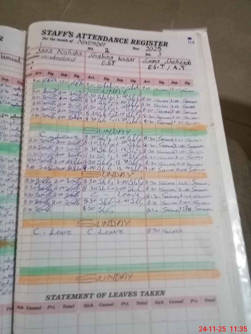 | Remarks (Use Separate Page if Required): Zunaira Ajmal PST is absent from duty since 1st May 25 to till date DEO visited on 5 May 25 | |||||