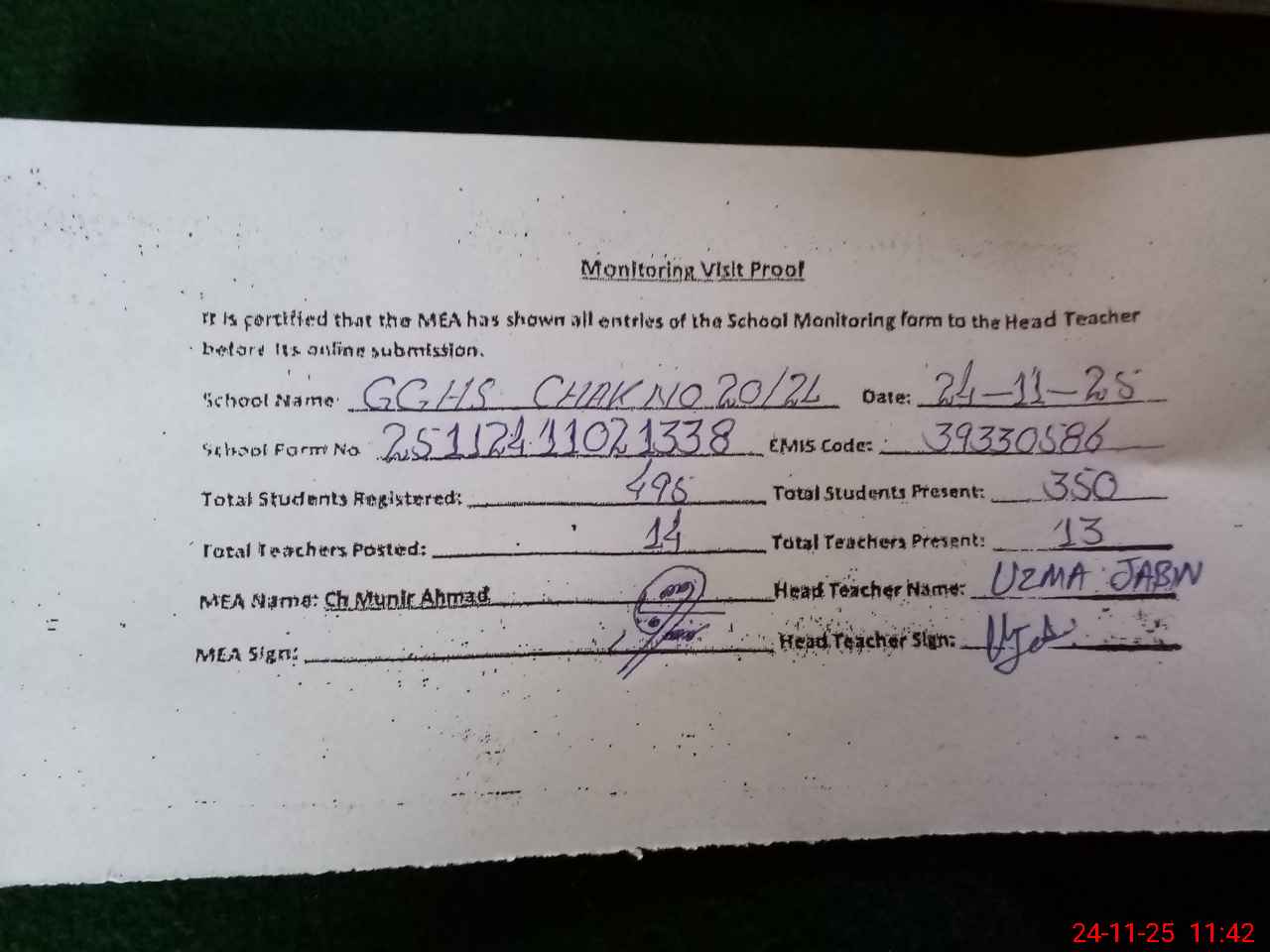 | Attendance Register | Head Teacher | MEA with School | Visit Proof |