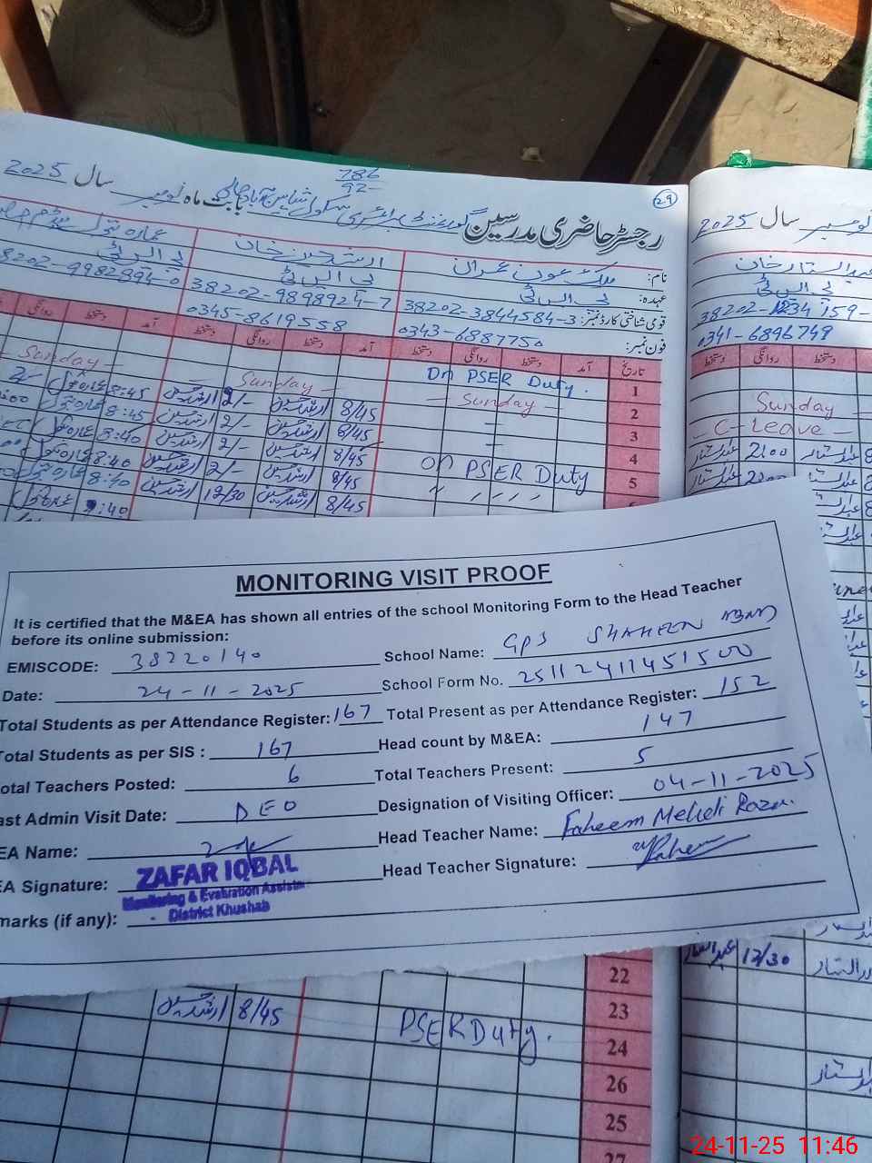 | Remarks (Use Separate Page if Required): last visit. DEO 04 November 2025 Total on register 167 Total on sis 167 | |||||