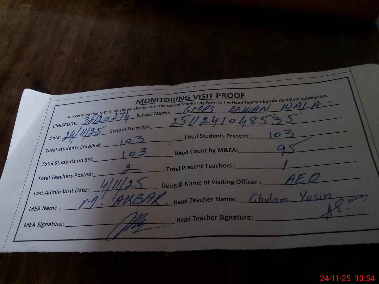 | Attendance Register | Head Teacher | MEA with School | Visit Proof |